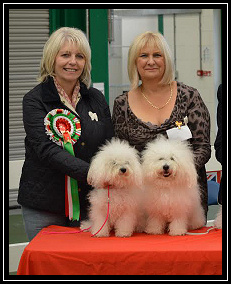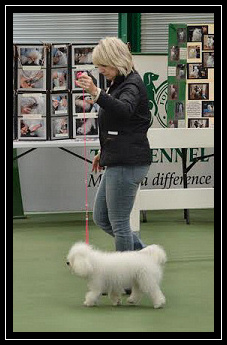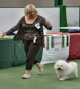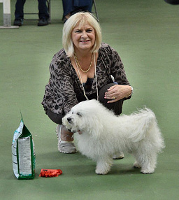 UK TOY DOG CHAMPIONSHIP SHOW 2014 We went along to the show with a car full of Bolognese and what a lovely day we had. Our Int. Ch. Predatino Bengi of Moorhey was given Best of Breed (BOB). We thank judge Ms Kathy Begg for thinking so highly of him. Above Bengi at UK Toy Dog Show